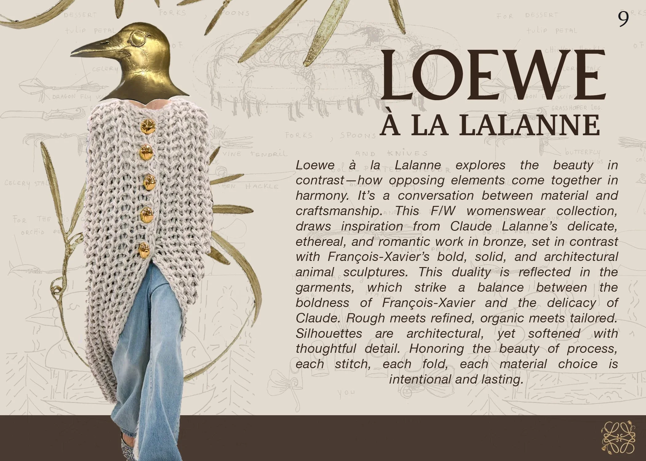 Loewe à la Lalanne is a collection that explores harmony through contrast, where Claude Lalanne’s ethereal delicacy meets François-Xavier;s bold architectural forms while keeping Loewe’s essence. This collaboration redefines the meaning of luxury and the timeless dialogue between art and fashion.
